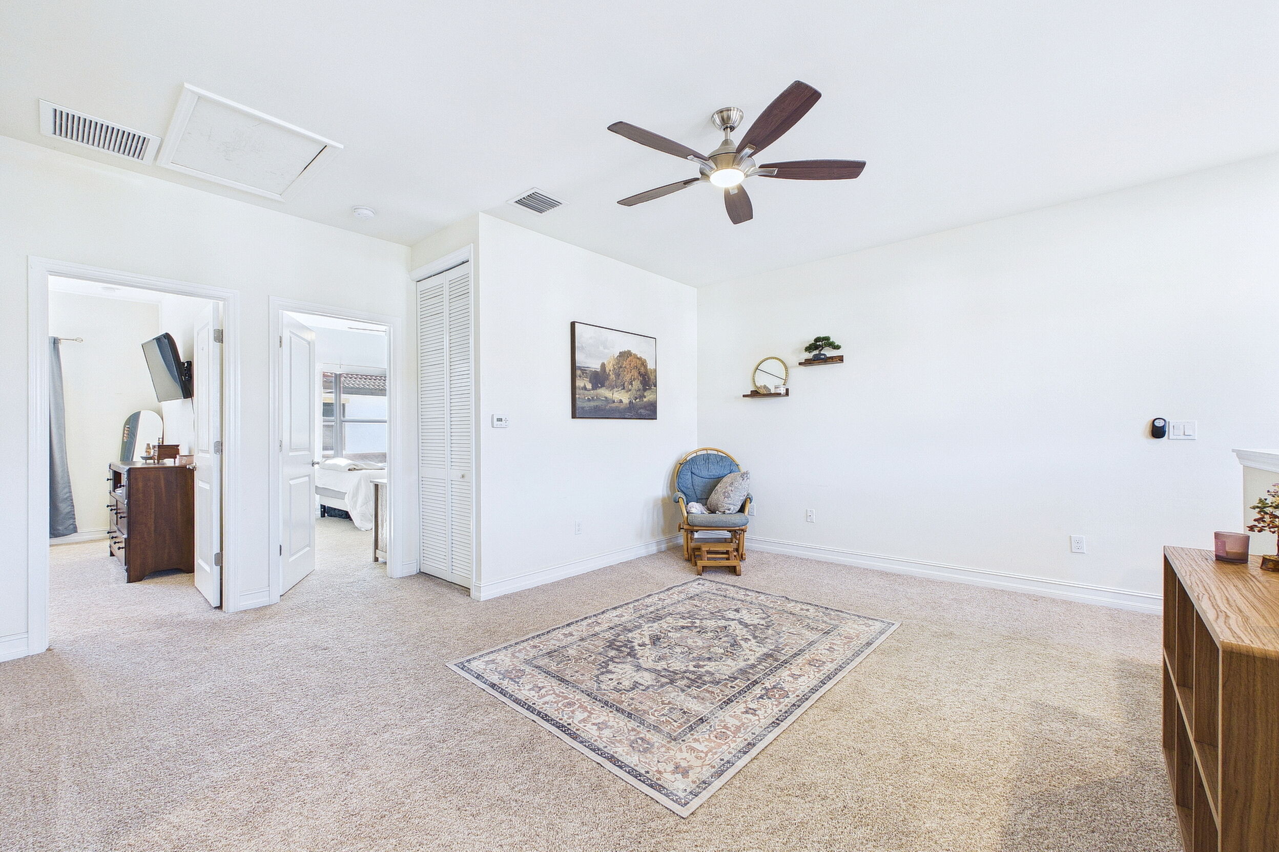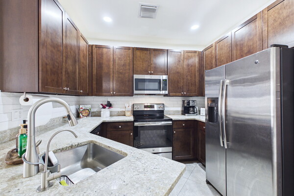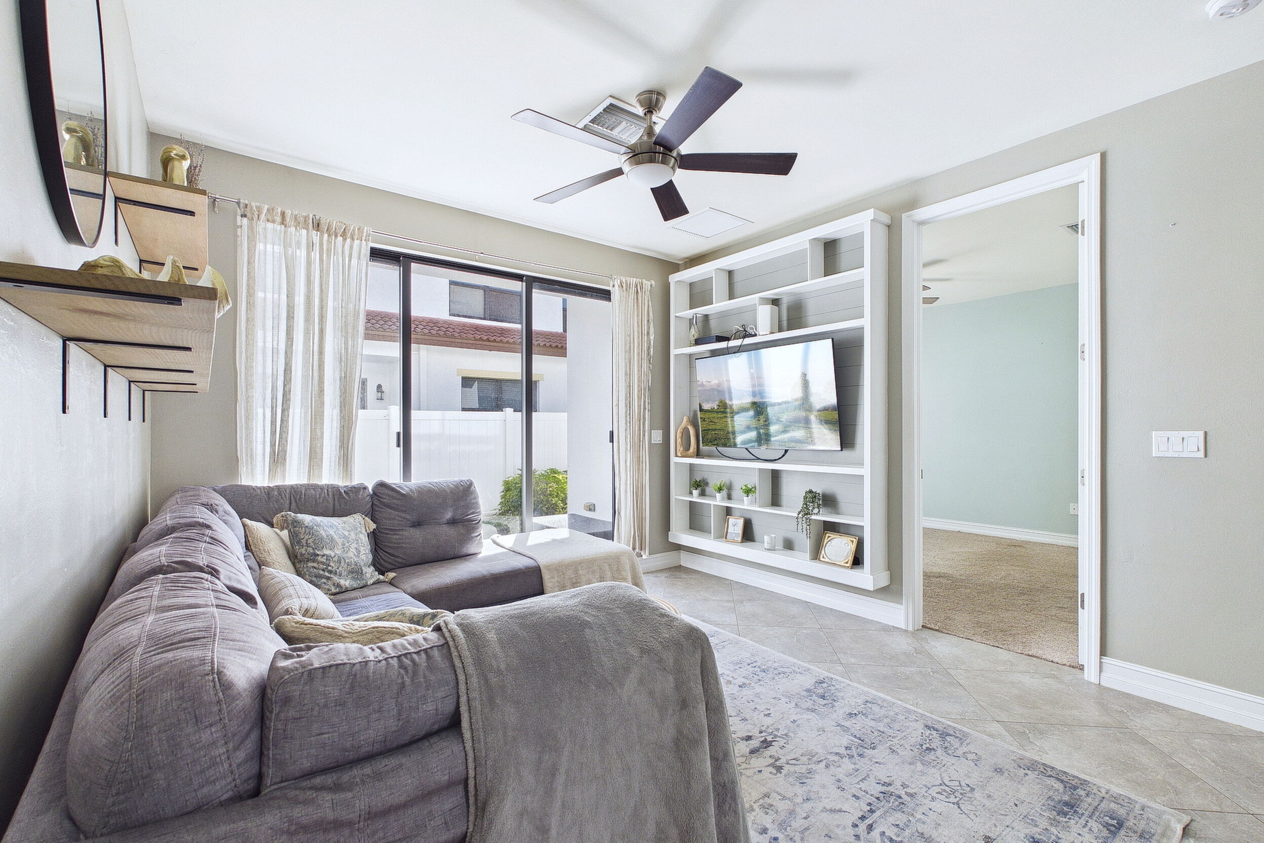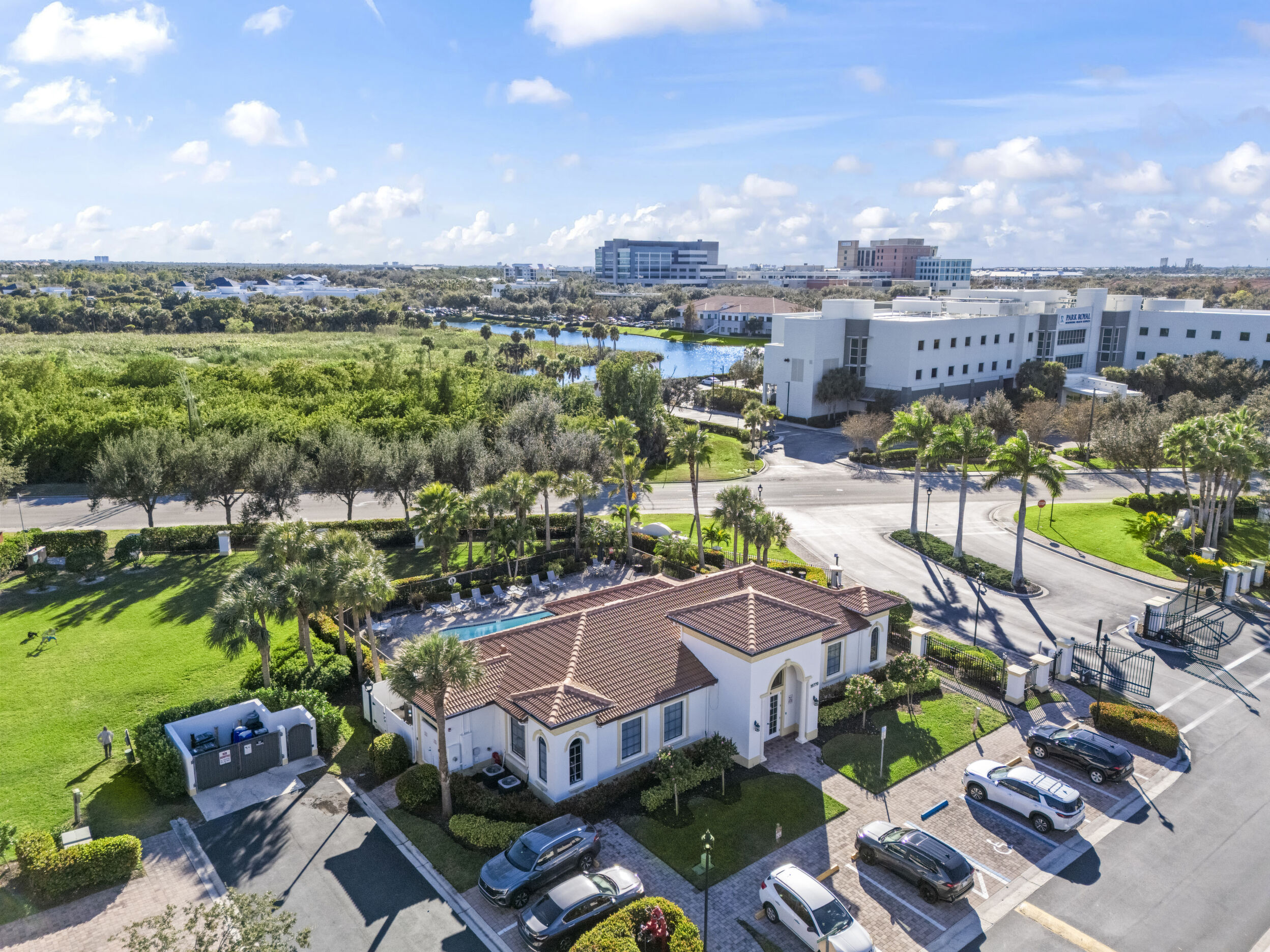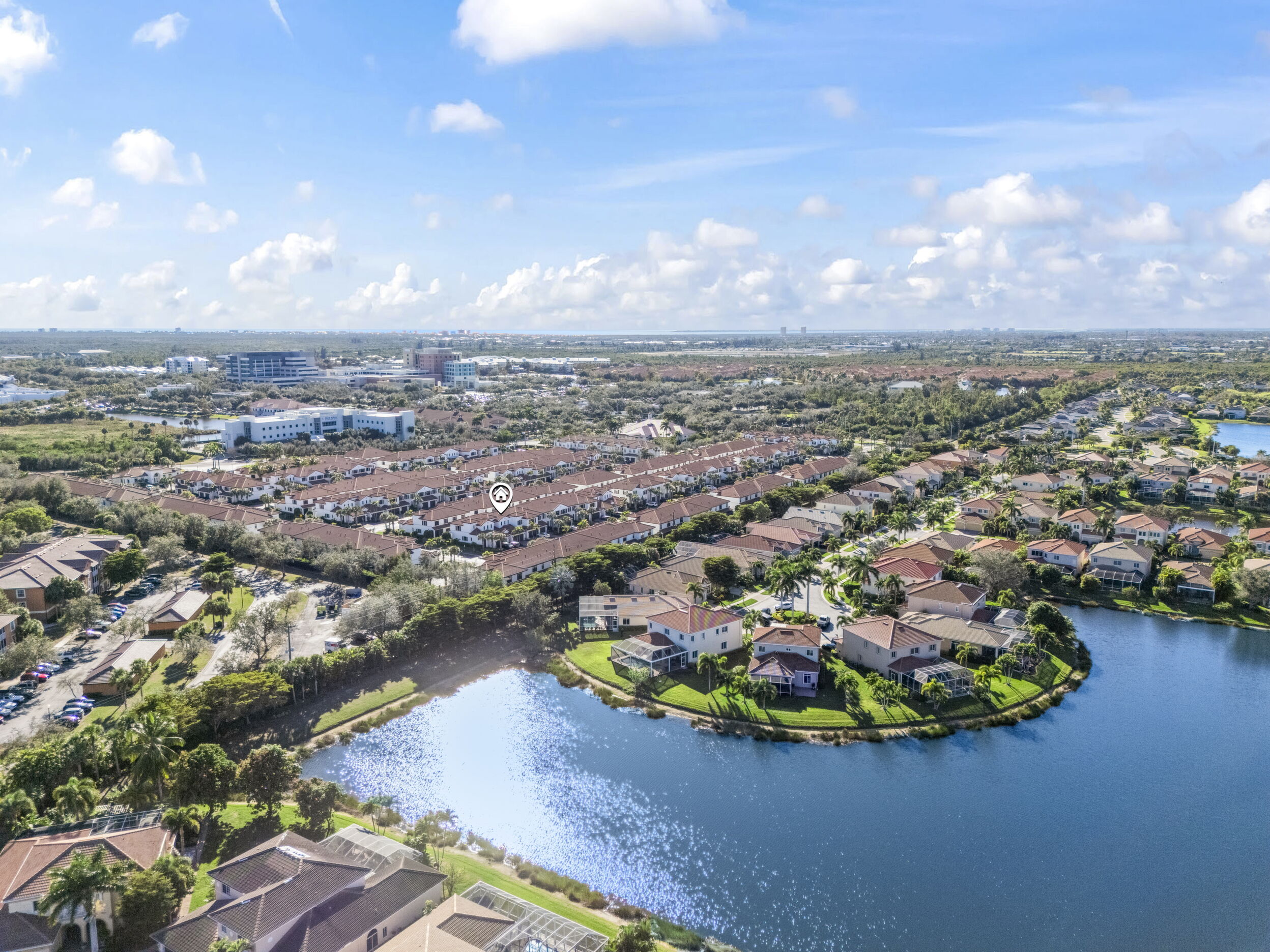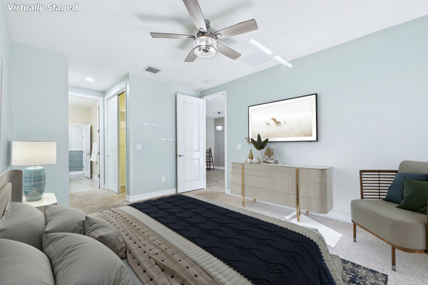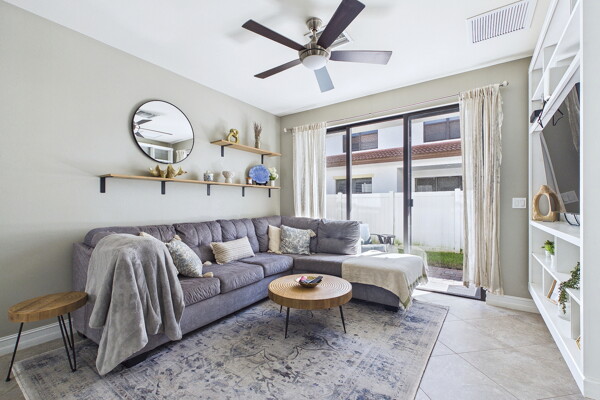 Welcome to Villa Medici-Florida living at its finest. This beautifully maintained, move-in-ready residence is nestled within the highly desirable gated community of Villa Medici, celebrated for its charming Italian-inspired architecture and resort-style amenities. Offering 3 bedrooms and 2.5 bathrooms, this spacious home features a thoughtfully designed floor plan with the primary suite conveniently located on the first floor, complete with a private en-suite bath. The downstairs living area is enhanced by custom built-in bookshelves, adding both warmth and functionality. The kitchen is well appointed with 42" wood cabinetry, granite countertops, and stainless steel appliances, and flows effortlessly into the main living space-ideal for everyday living and entertaining. Tile flooring extends throughout the foyer, kitchen, living room, and all bathrooms for both style and easy maintenance. Upstairs, you'll find a versatile family room/loft, two additional bedrooms, and a full bath-perfect for guests, a home office, or a private retreat. The upstairs family room and bedrooms are comfortably carpeted, creating a cozy and inviting atmosphere. A standout feature of this home is the rarely available two-car garage, a true bonus in Villa Medici. The garage offers abundant storage, including overhead storage racks above the garage door, and is equipped with a high-quality "Skeeter Beater" screen, allowing the space to easily double as a screened outdoor living or entertaining area. Residents enjoy access to a clubhouse and resort-style pool, while the HOA provides exceptional value, covering water, sewer, trash pickup, landscaping, irrigation, exterior maintenance, pest control, gated entry, and cable with three boxes. Flood insurance is transferable, providing additional peace of mind. This home is truly move-in ready-ideal for seasonal or year-round Florida living.
